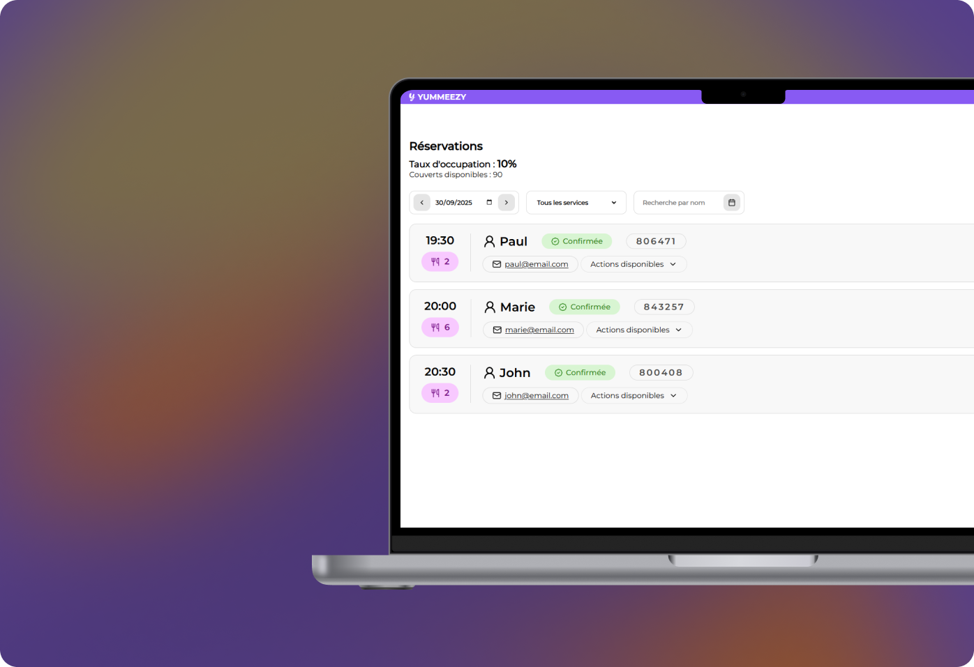 Yummeezy, c’est un module de réservation multilingue affiché sur votre site ou accessible depuis vos réseaux sociaux, et optimisé pour une réservation simple et rapide. Mais aussi, un espace restaurateur vous permettant de consulter et gérer vos réservations, et surtout, de vous apporter de la flexibilité grâce aux paramètres.