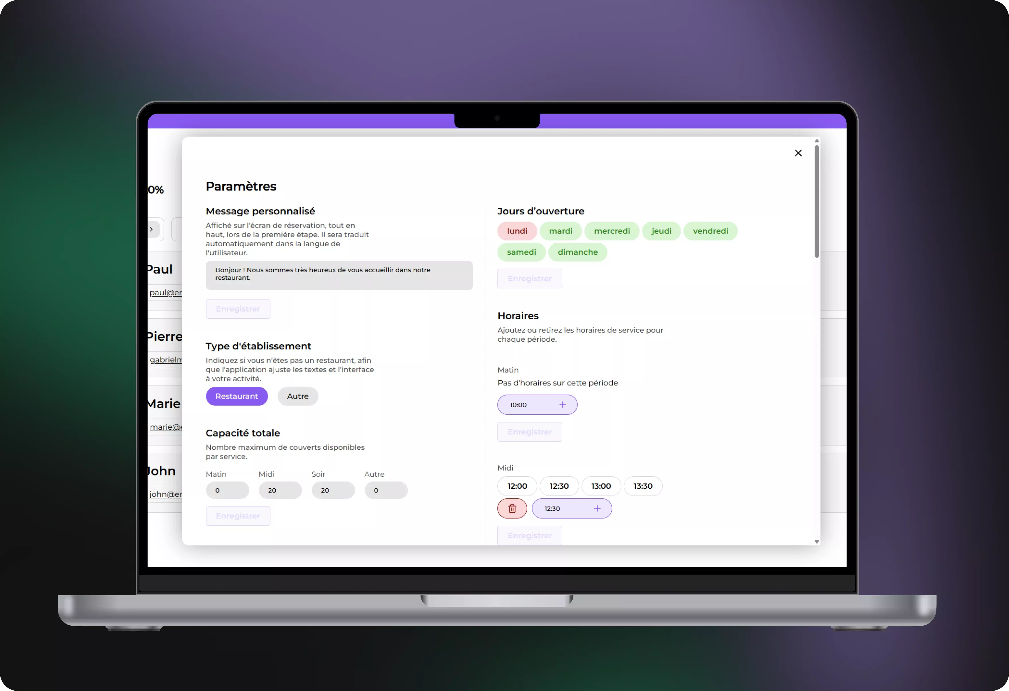 Via les paramètres, spécifiez votre capacité pour les différents services. Indiquez vos jours d'ouverture et les horaires de réservation disponibles, rajoutez des plages de dates de fermeture, et choisissez parmi deux modes de calcul de couverts restants.