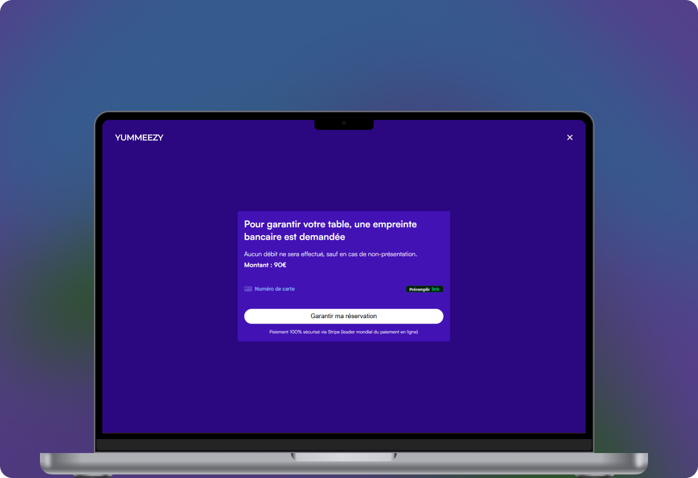 Yummeezy vous permet de spécifier le nombre de couverts à partir duquel une empreinte bancaire est demandée au client, ainsi que le montant par couvert. Vous êtes libre d'activer ou pas cette fonctionnalité.